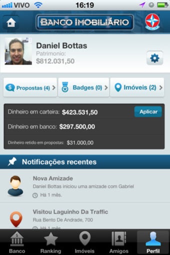 Falando em conta, o Banco Imobiliário Geolocalizado possui um banco virtual completo dentro do aplicativo. Você consulta extratos, faz saques e depósitos, contrata seguros residenciais e até solicita créditos imobiliários. A gestão do dinheiro é o ponto-chave do jogo.